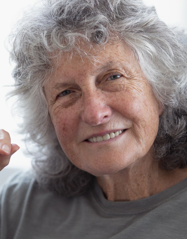 This is a gentle retouch. The freckles and wrinkles and sun damage have been softened but the freckles and wrinkles are still visible. She still looks like herself.